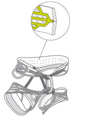 Edelrid verwendet diese Technologie in erster Linie bei den Alpingurten, bei denen minimales Gewicht und ein kleines Packmaß ausschlaggebend sind. Bei dieser Konstruktion wird das Außenmaterial, das tragende Gewebe und das innere Polster aufeinander laminiert. Dadurch wird eine optimale Lastverteilung über den gesamten Hüftgurt erreicht. Durch die flächige Kraftverteilung ist hier ein dickes Polster unnötig. So können ein geringes Gewicht, eine flache Konstruktion und ein minimales Packmaß miteinander kombiniert werden.
