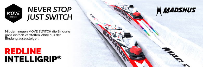 Dreht man den roten MOVE Switch gegen den Uhrzeigersinn, schiebt sich die Bindung zum besseren Gleiten bis zu 24 mm nach hinten, weil weniger Gewicht des Läufers die Steigzone in die Loipe drückt. Dreht man den roten Knopf im Uhrzeigersinn, schiebt sich die Bindung bis zu 12 mm nach vorne. Der Grip nimmt zu, weil der Läufer die Steigzone mit mehr Gewicht in die Spur drückt.